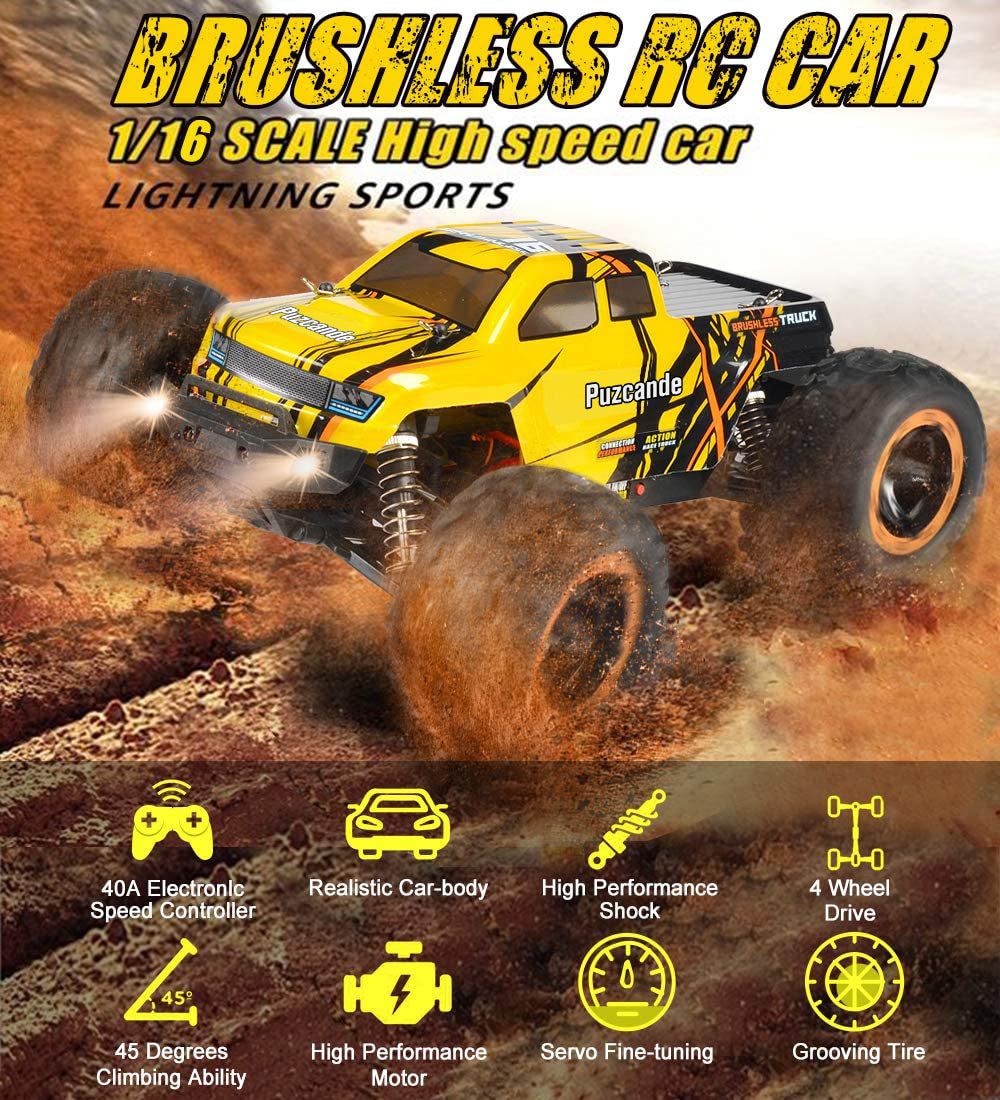 - 【BRUSHLESS MOTOR】: This RC Truck equipped with the powerful brushless motor, which made the speed and lifetime of this rc car will be greatly increased. The life of the brushless motor is 2-3 times that of the brushed motor. And the power consumption is only 1/3 of the brushed. Provide you with longer fun.