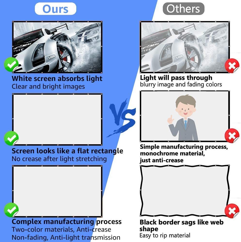 - 【Anti-crease and Water-cleanable】Our projector screens is made of high quality polyester and spandex materials, which will be no creases or wrinkle on its smooth elastic surface.And you can be wash by hand.