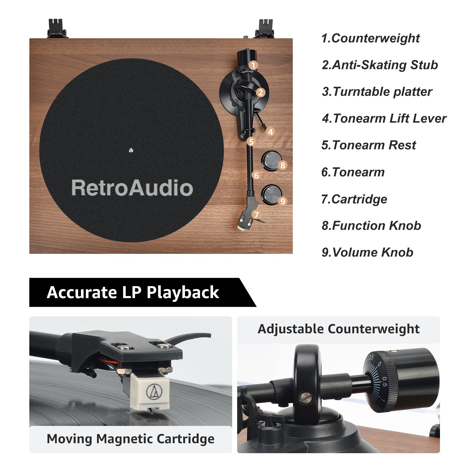 Hefty Iron Platter & Accurate Counterweight: iron platter is designed to reduce vibration and increase the clarity of the hi-fi sound, better for stable and accurate rotation. Adjustable counterbalance of counterweight can independently adjust the tracking force of the needle accurately.