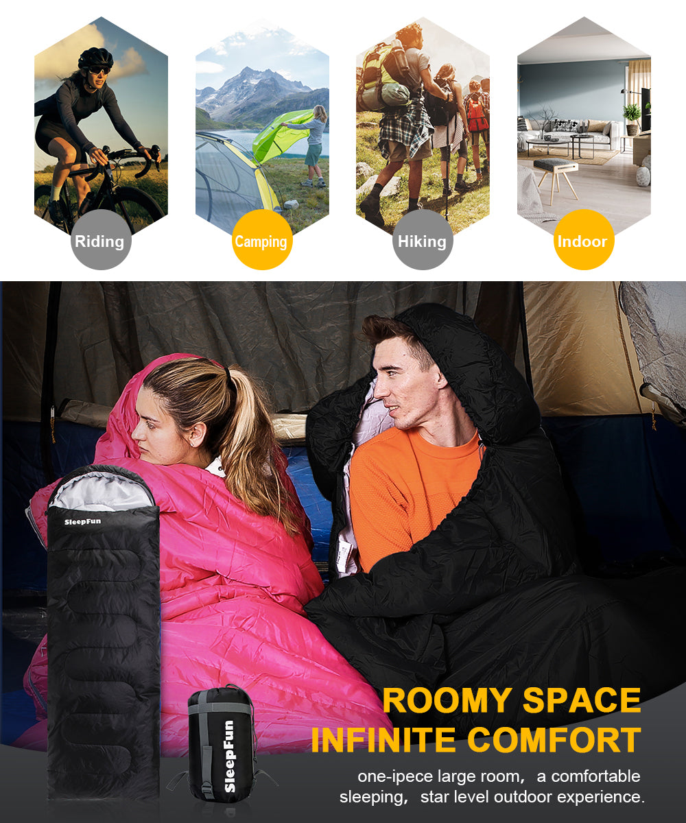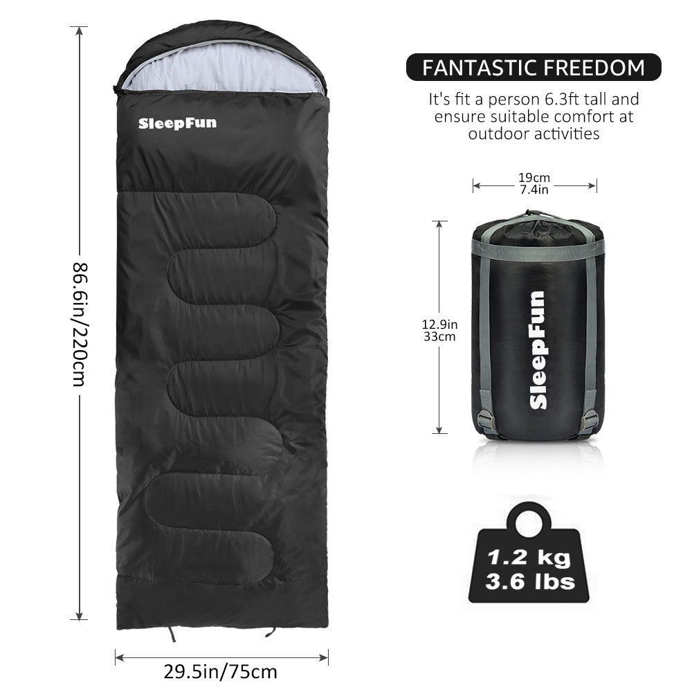- 【Keep You Comfy & Cozy】The lining material of this ultralight Sleepfun sleeping bag is made of first-rate 100% Polyester, ensure durability and non-allergenic.The outer fabric is 100% polyester 210T, which is tear-resistant, waterproof and breathable. Double-layer technology keep you warm in wet conditions and prevent you from getting damp.